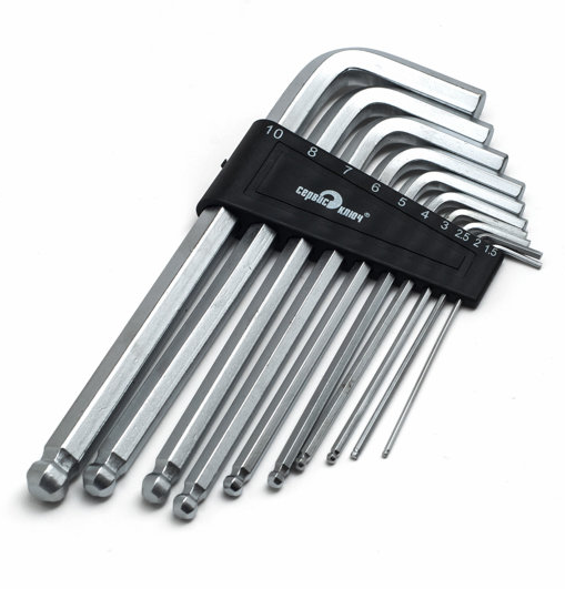 Набор состоит из десяти шестигранных ключей разных размеров: 1.5, 2, 2.5, 3, 4, 5, 6, 7, 8, 10 мм. Каждый Г-образный шестигранник этого набора имеет шаровидную форму на одном конце, которая обеспечивает угол вращения до 25 градусов и защиту от соскальзывания. Ключи изготовлены из хромованадиевой стали, которая обладает высокой прочностью и износостойкостью. Набор поставляется в пластиковом держателе, который удобно хранить и переносить.